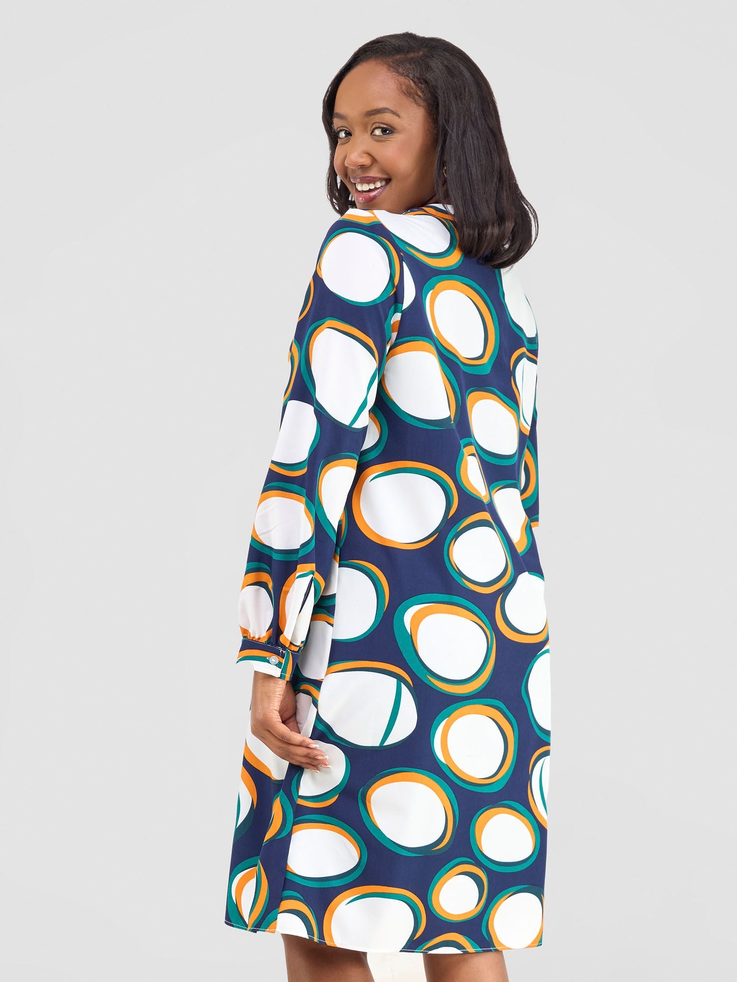 Vivo Zena Long Sleeve Mandarin Collar Shift Dress - White / Teal Polka Print